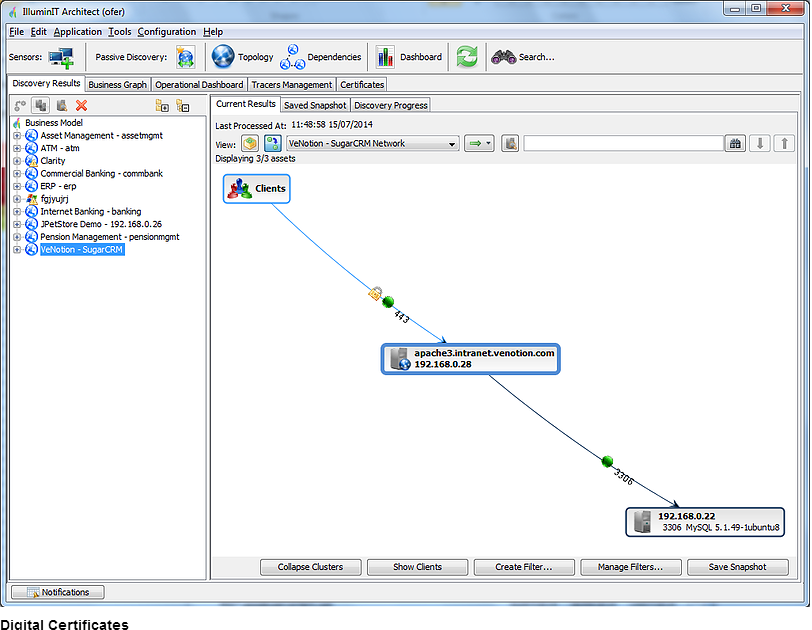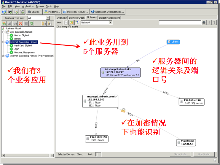 VNT公司的IlluminIT™产品自动发现并映射出每一个业务应用是如何流转并利用IT基础设施的,使您能够从业务视角来进行IT 管理。IlluminIT 通过一个清晰的图像呈现出了各种服务器如何影响业务应用,以此促进了有效规划,并且能够监视事件对业务的影响,即时地对变更进行模拟与审计。